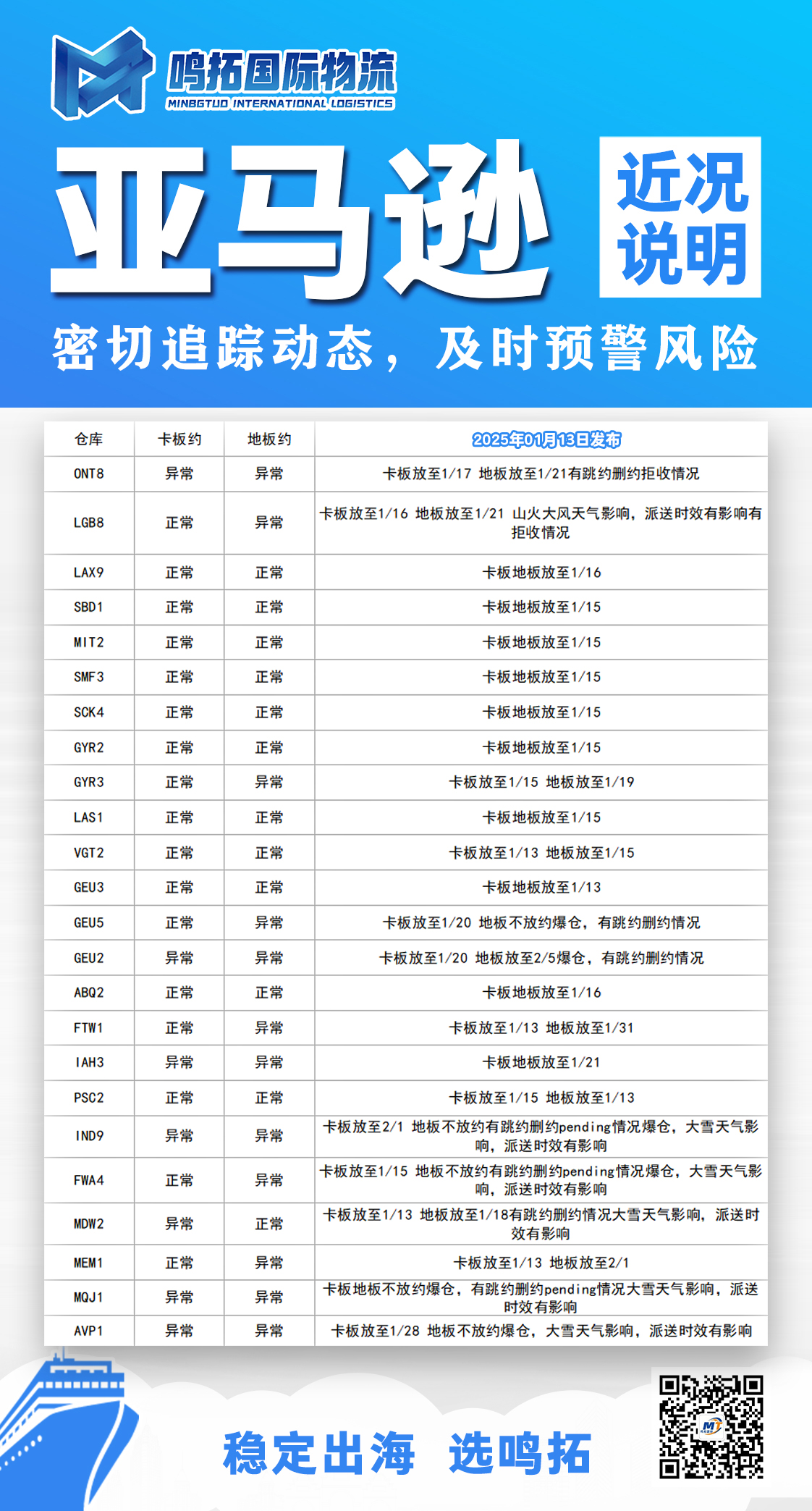 近日,鸣拓国际物流发布了最新的亚马逊仓库近况说明,旨在帮助客户及时了解各仓库的运营情况,以便更好地安排物流计划。